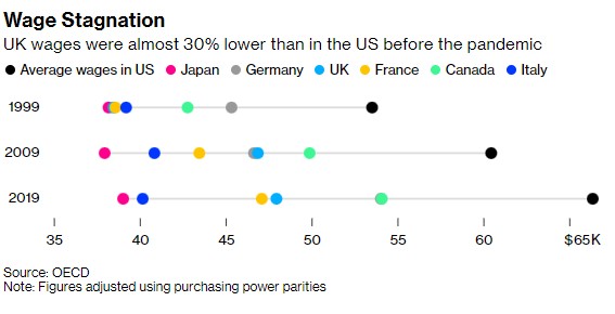 住房是对消费者最明显的消耗,但工资增长同样滞后。经通胀率调整后的实际工资正在以20年来最快步伐下降。即使在2019年,英国的工资水平仍远远落后于美国和加拿大。