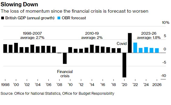 总体数据显示当前英国面临的形势空前严峻。第二季度英国经济有可能萎缩,这使得英国陷入经济衰退的概率增加。从预测数据来看,英国经济前景看起来并没有市场预期那样悲观,英国政府官员们预计2023-2026年经济增长将会稳定在1.8%的年增长率水平,但低于趋势水平。然而,已经困扰了这个国家十多年的疲弱生产力问题似乎没有结束的迹象。