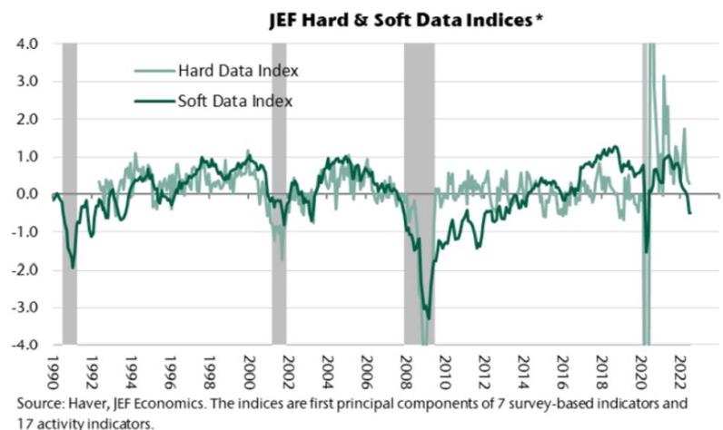 投资者通过软数据,来构建第四季度和明年第一季度衰退预测。但这又一个关键的前提,那就是调查是一个良好的领先指标,但Jefferies的经济学家表示,由于过去十年与经济活动和GDP的相关性较差,这些数据会产生误导。